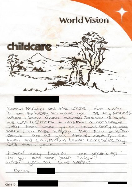 World Vision ist eine christliche Hilfsorganisation, die humanitäre Nothilfe und langfristige Entwicklungsarbeit leistet und dabei die Überwindung von Armut, Hunger und Ungerechtigkeit in den Mittelpunkt stellt. Durch die Übernahme einer Kinderpatenschaft unterstützte der Fanclub World Vision unter dem Motto „Hilfe zur Selbsthilfe“ bei der Finanzierung von Schulbildung und medizinischer Versorgung für ein Mädchen in Afrika. Für Pakete mit kleinen Geschenken bedankte sich das Patenkind mit Briefen und Zeichnungen.