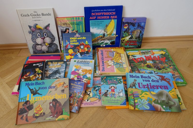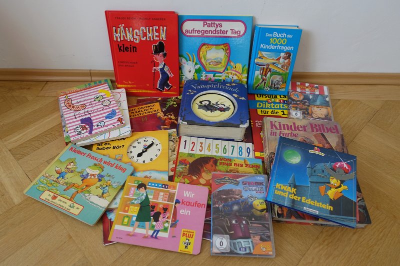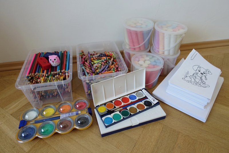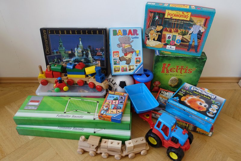 Buntstifte, Wachsmalkreiden, Straßenkreiden, Wasserfarben, Malvorlagen, Holzbausteine, Kinderbücher, Gesellschaftsspiele, Fußballtore