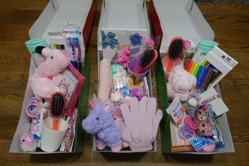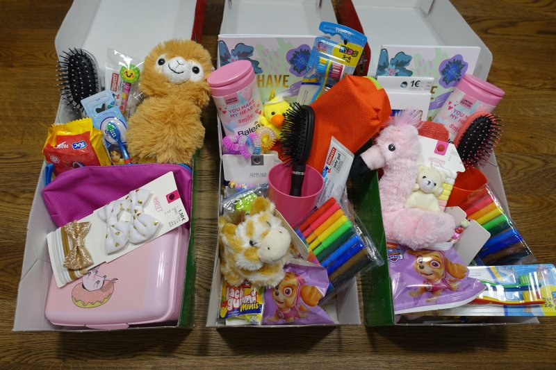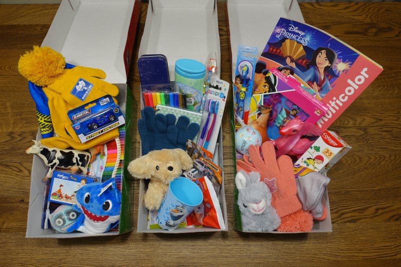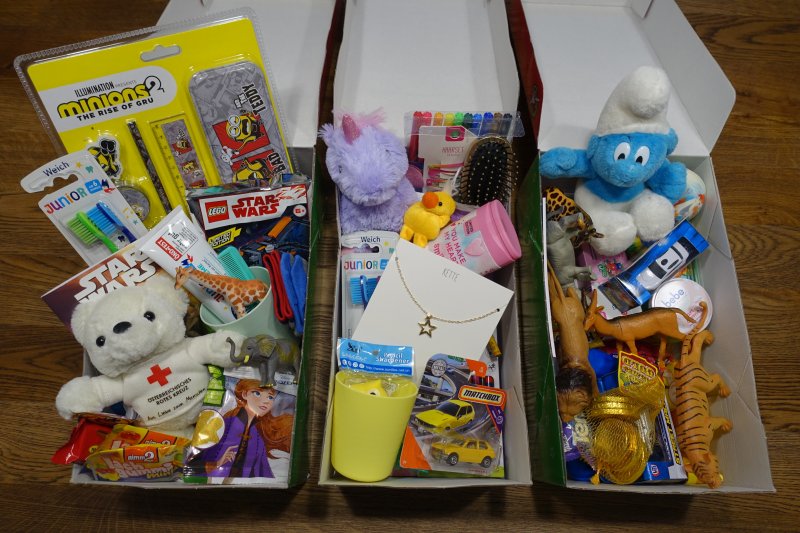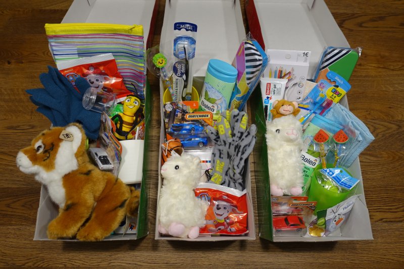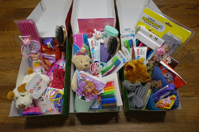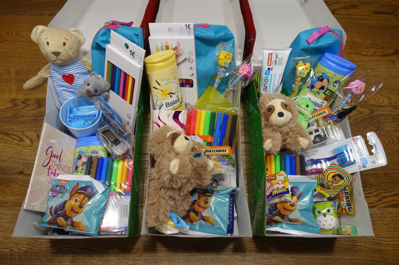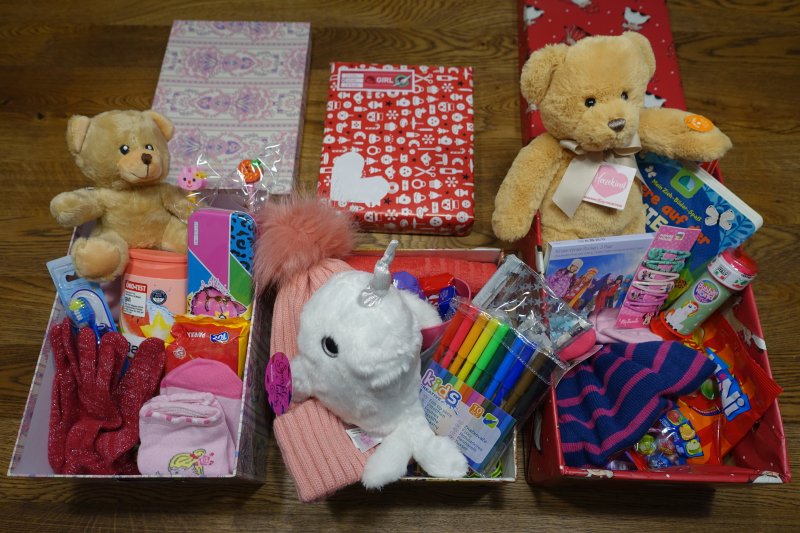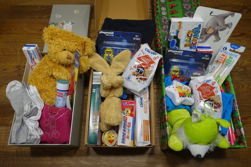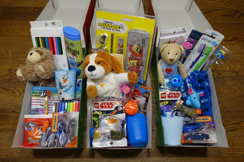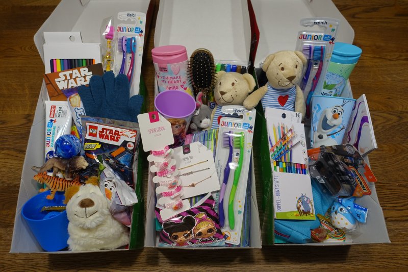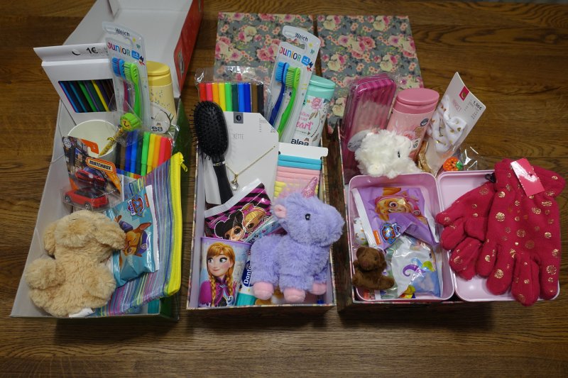 Geldspende in der Höhe von 350 Euro, sowie 51 Kartons mit Geschenken (Spielsachen, Kleidung, Süßigkeiten, Hygieneartikel, …)