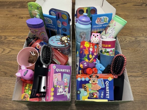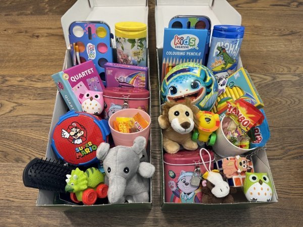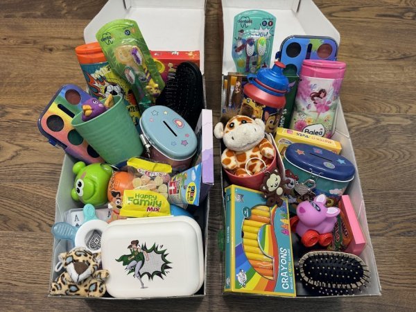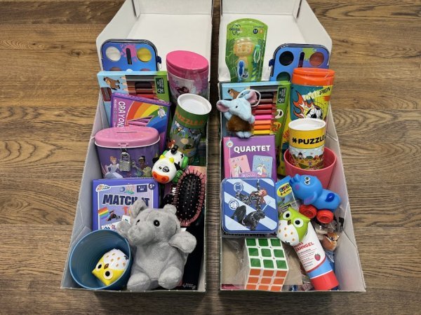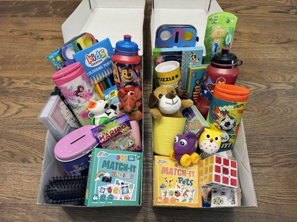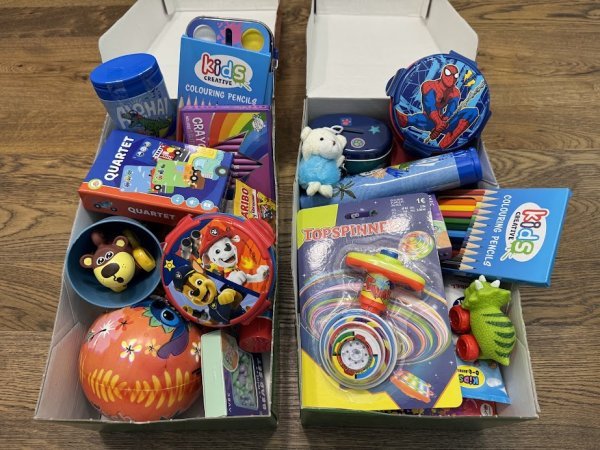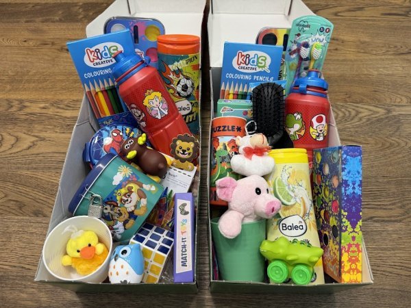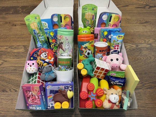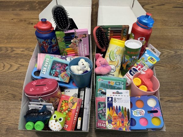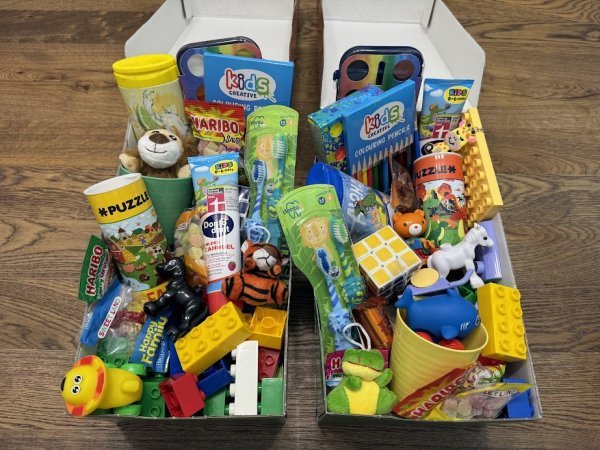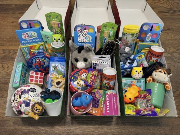 Geldspende in der Höhe von 200 Euro, sowie 25 Kartons mit Geschenken (Spielsachen, Hygieneartikel, Bastelmaterial, …)