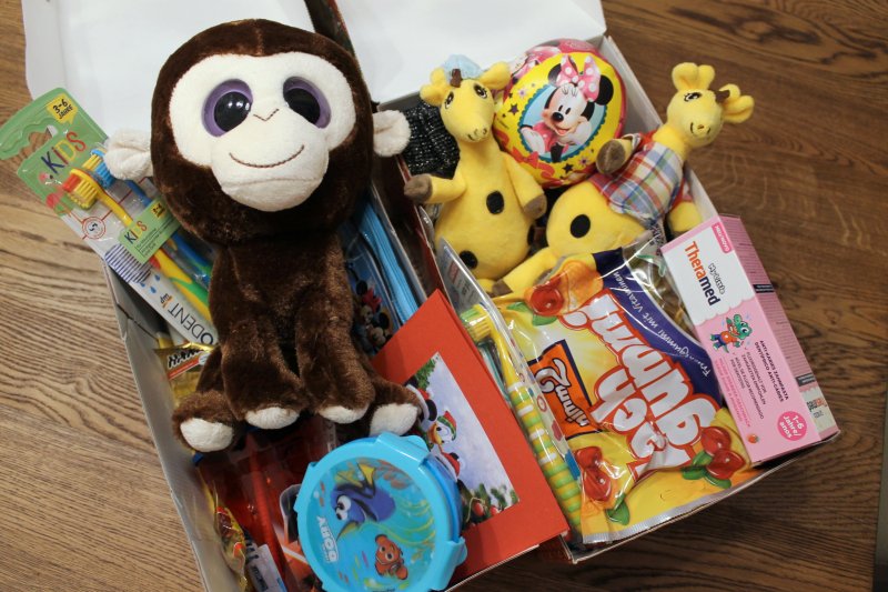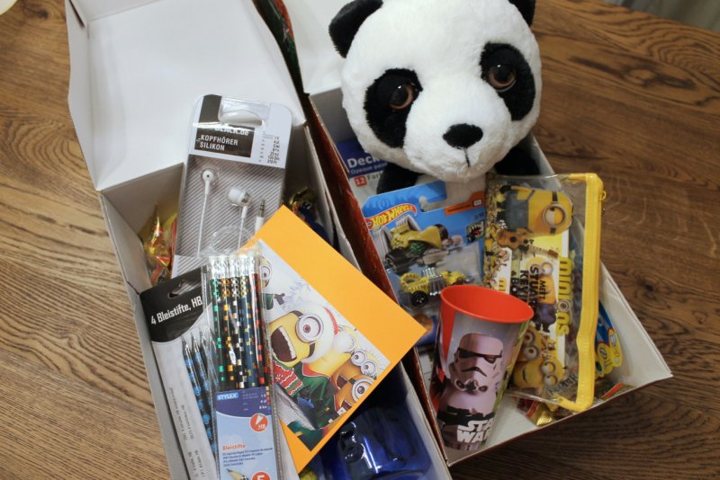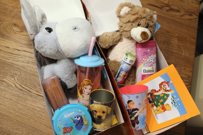 Geldspende in der Höhe von 200 Euro, sowie 78 Kartons mit Geschenken (Spielsachen, Kleidung, Süßigkeiten, Hygieneartikel, …)